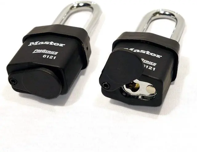 Ideal for harsh outdoor conditions - exclusive Pro Series Weather Tough cover protects lock from water, ice, dirt and grime. Solid iron shackle shroud resists harsh physical attacks. The removable cylinder can be replaced or re-pinned. 5 spool pin tumbler cylinder for added pick resistance. Dual ball bearing locking mechanism resists pulling and prying.