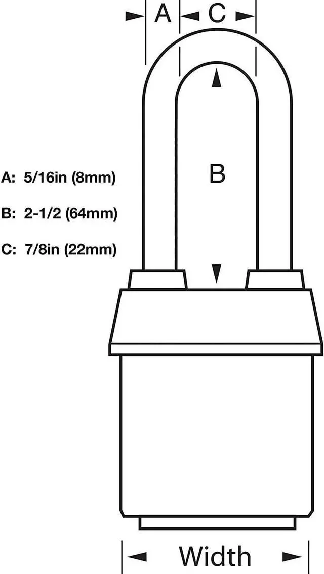 DIMENSIONS: 2-1/8 wide heavy steel body. A 5/16 diameter hardened boron alloy shackle with 2-3/16 inside height clearance.