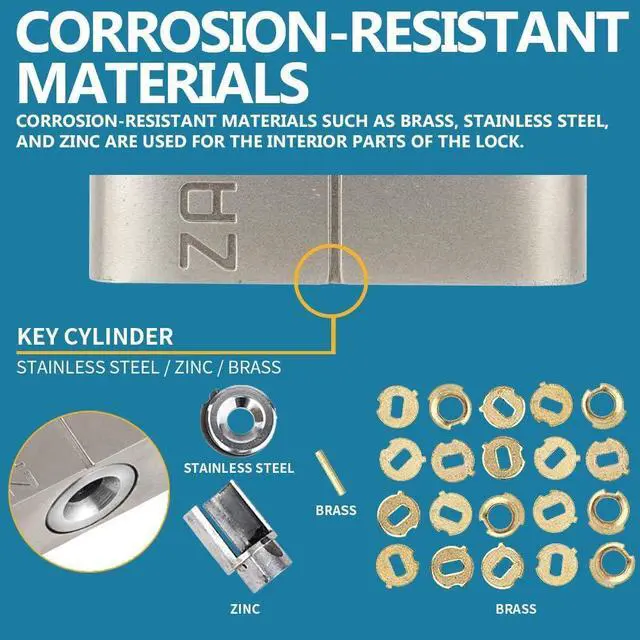 Rust-proof & strong durability : Strong body made entirely of zinc and STAINLESS STEEL (SUS 304) shackle with strength and weather-proof abilities provide strong resistance to cutting. Corrosion-resistant materials, such as brass, STAINLESS STEEL, and zinc, were used to make the internal components.