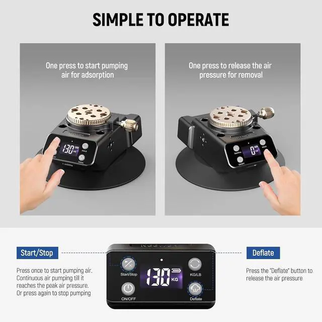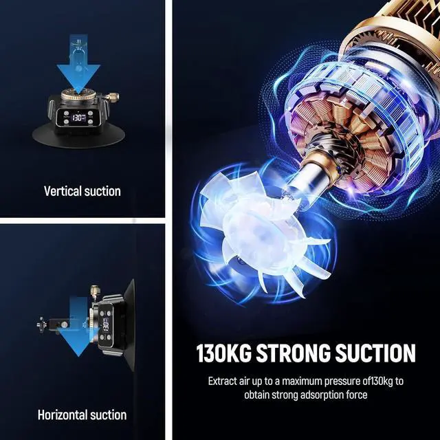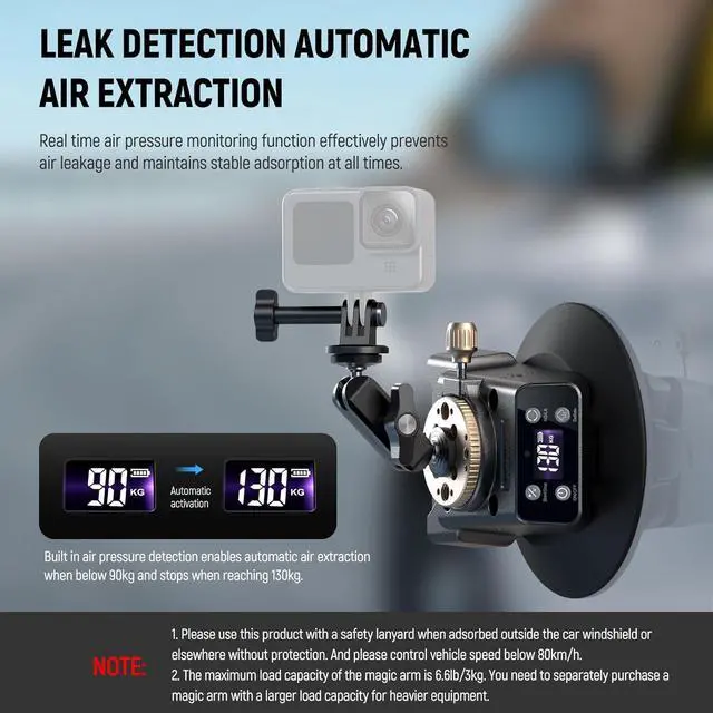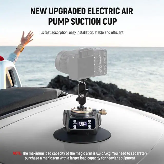Premium Construction Crafted with rigid aluminum alloy, the electric suction cup mount can withstand uncertain outdoor environments. The silicone rubber cup is robust and easy to clean with water.