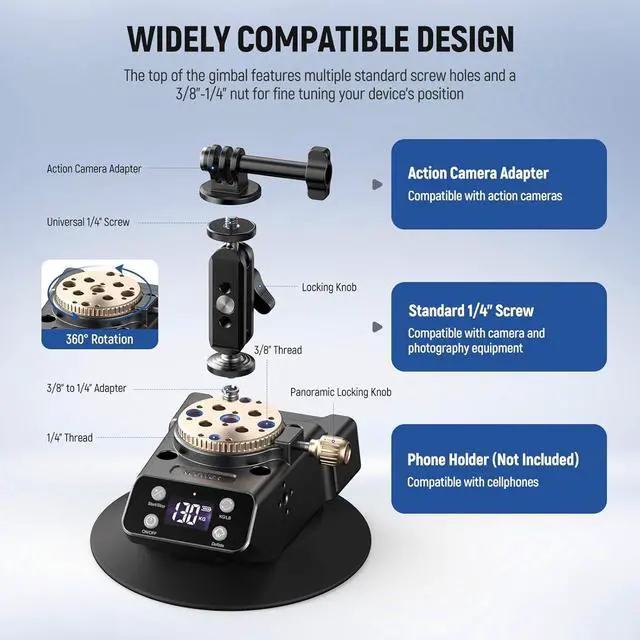 Multiple Devices Supported The top of the suction cup can be rotated 360°. 1/4" and 3/8" threaded holes can install a variety of equipment and accessories. The ball head magic arm for an extension. The 1/4" thread on the articulating magic arm can connect a vlog camera, DSLR camera, LED light, etc. Includes a mount adapter for action cameras