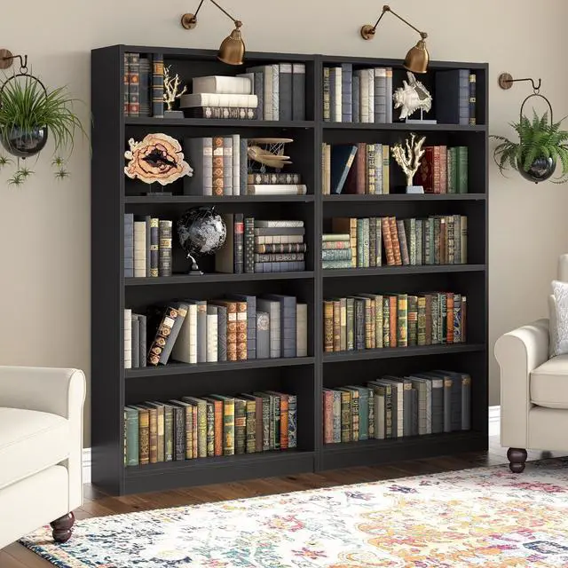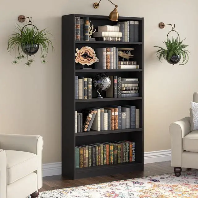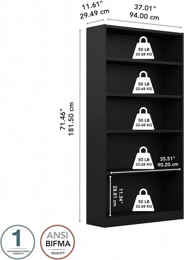 The Bush Furniture Universal Tall 5 Shelf Bookcase provides a versatile organization solution that makes it easy to show off your personal library or brighten up the room with pictures and decorations. Perfect for residential and professional use, this durable 72 inch bookshelf is designed to excel anywhere flexible storage and display capacity is needed. Three adjustable shelves move up and down to accommodate larger items like reference materials, binders and photo albums while two fixed shelves offer added stability. The sturdy one-inch thick shelves have a weight capacity of 50 pounds each, so storing paperback and hardcover books, vinyl records, DVDs or video games is never a problem. Wall attachment hardware is included for family-friendly safety and security in a home office or living room. A variety of finish options allow you to find the perfect look to match with your current decor. This tall 5 tier bookshelf has been meticulously tested to meet or exceed ANSI/BIFMA quality standards for safety and performance and is backed by the Bush Furniture 1 Year Manufacturer's Warranty.