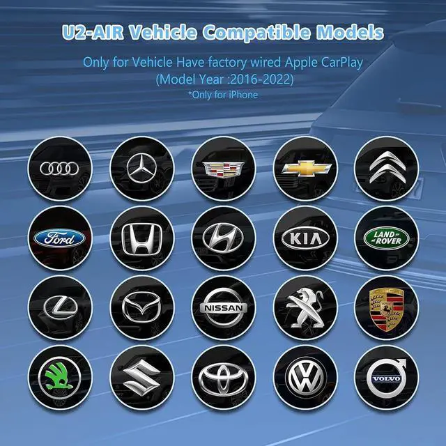 year: 2016-2022. Suitable for iOS10 and above. As long as this requirement is met, most models are compatible. U2 -AIR Wireless CarPlay Dongle is suitable for: Mercedes / Volvo / Jeep / Kia / Lincoln / Ford / Chevrolet / Land Rover / Lexus ect. Some models only support operation using the remote control, such as the Mazda CX-4).