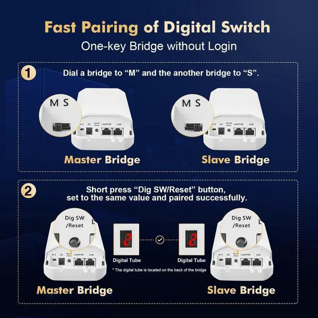 LED & WEB ManagedPower, LAN, signal, and channel indicators can clearly display the working status of the device and wireless signals, easy to install and maintain. Support WEB GUI management, access master and slave bridges through management IP on PC, view device status, set wireless parameters, data statistics, etc.