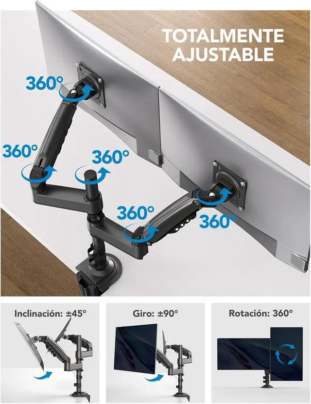 Full-Motion Flexibility With 90° tilt, 180° swivel, and 360° rotation, this monitor stand provides ultimate flexibility to customize your viewing angles. Adjust the screens to reduce glare, switch between sitting and standing positions, or find the ideal angle for video calls, gaming, or content creation. This dual monitor stand ensures you can achieve the perfect posture and view for all your tasks, boosting your efficiency and comfort.