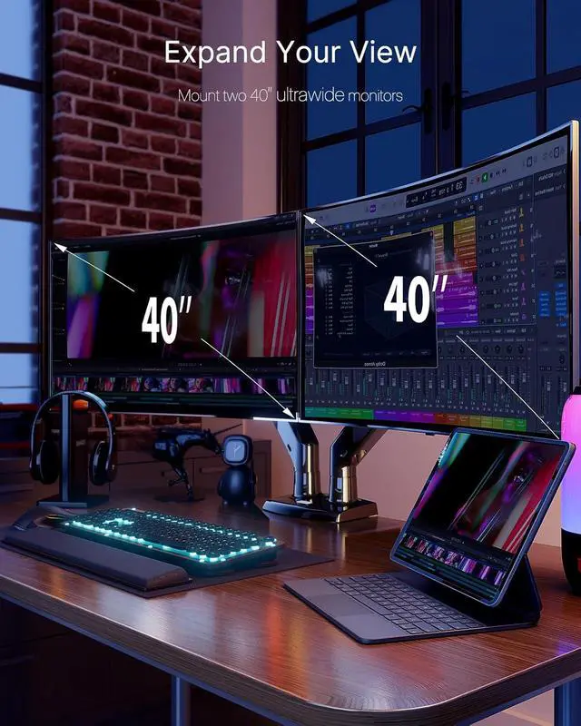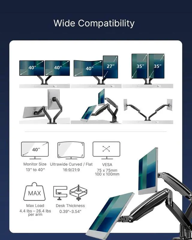 Wide Compatibility: The upgraded base and large arms make this dual monitor arm more stable so it can securely hold two 13-35 screens weighing up to 26.4lbs. Compatible with VESA 75x75mm and 100x100mm.