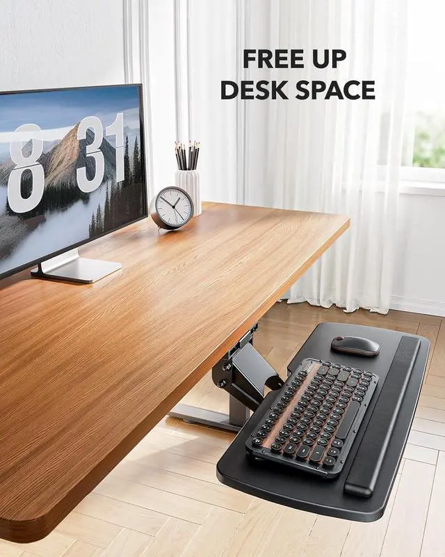 Easy Installation - All necessary hardware and instructions are provided for assembly. Please confirm that no crossbar under your desk OR at least 14.17" between the desktop edge and crossbar(if the entire keyboard tray must slide under the desk needs at least 16.22"), no legs and obstacles on either side of the desk OR at least 25" of width clearance(if the keyboard tray requires rotation needs at least 35.4"), and minimum desk thickness >0.6