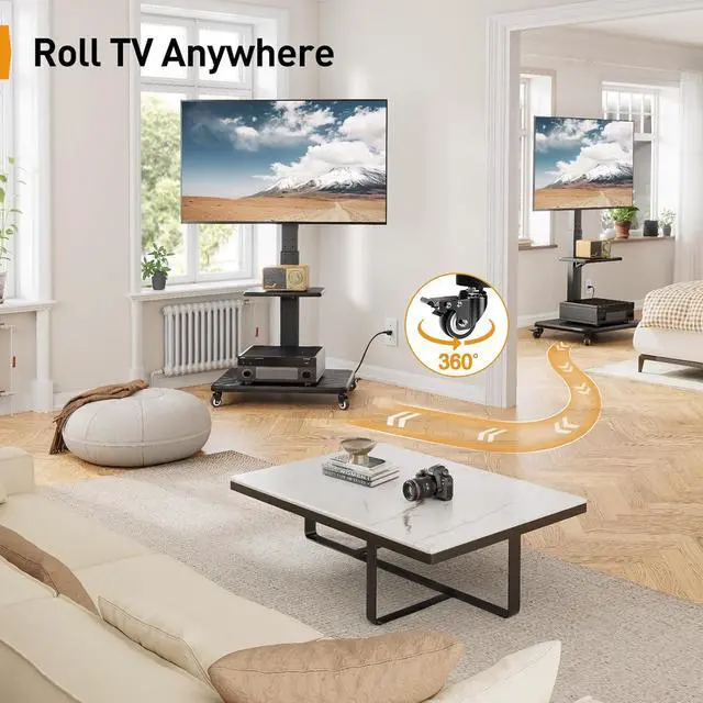 Rolling TV Cart Fits 32-75 inch TVsThe portable TV stand fits 32",40",42",43",50",55",60",65",70",75" flat-panel LCD/LED TVs, with VESA mounting patterns 100x100 to 600x400mm, The mobile TV stand is equipped with durable 360° wheels for smooth movement across multiple types of flooring. To keep the rolling TV cart stationary, simply lock the wheels to keep it in place.