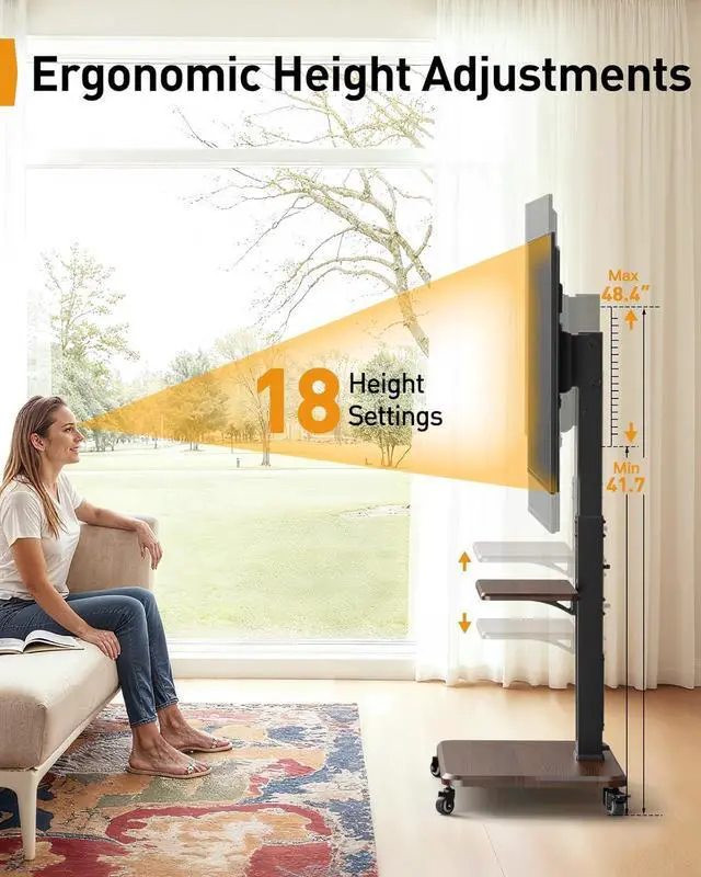 Ergonomic 18 Height SettingsThe mobile tv cart has 18 height settings ranging from 41.7 to 48.4. This flexibility is achieved through a modular combination of 3 TV hook heights, 3 TV column heights, and 2 TV plate heights,so you can find your ideal viewing height and maintain optimal comfort. Its ergonomic design helps improve posture, reducing neck and eye strain during long hours of viewing.