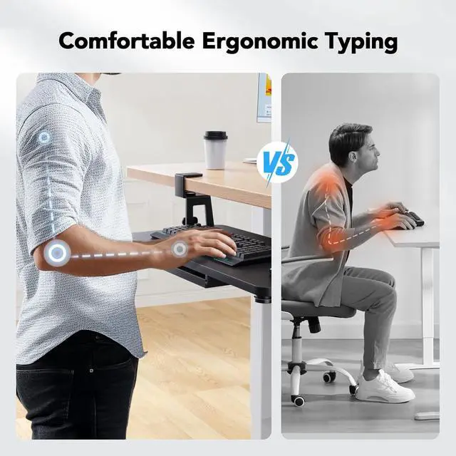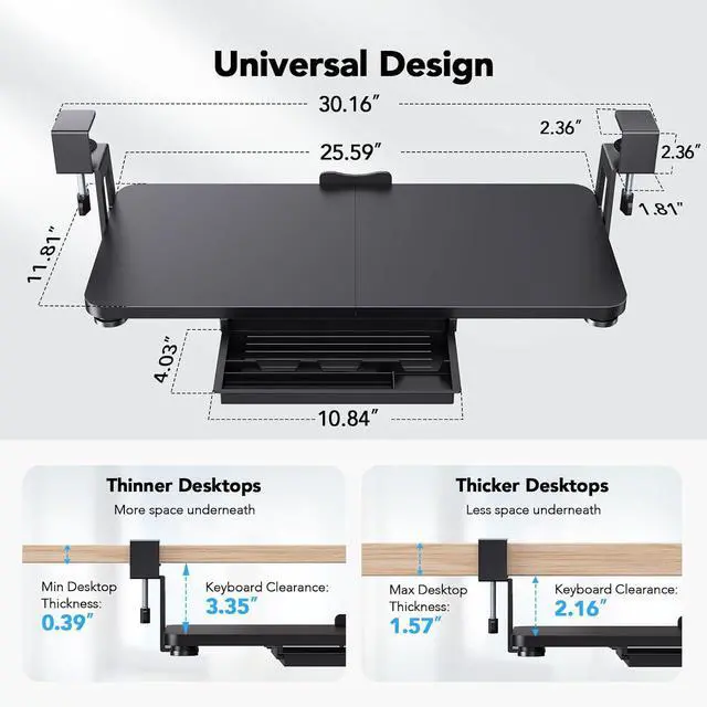 Space-Saving Design: With dimensions of 25.59 x 11.81(with clamps is 30.16), this under desk keyboard tray with drawer can hold your keyboard, mouse, and accessories conveniently under your desktop. The compact drawer is ideal for storing earbuds and small items to keep your desktop organized. NOTE: The total length of the keyboard tray under desk with clamps is 30.16, so please ensure desktop width clearance before purchase.