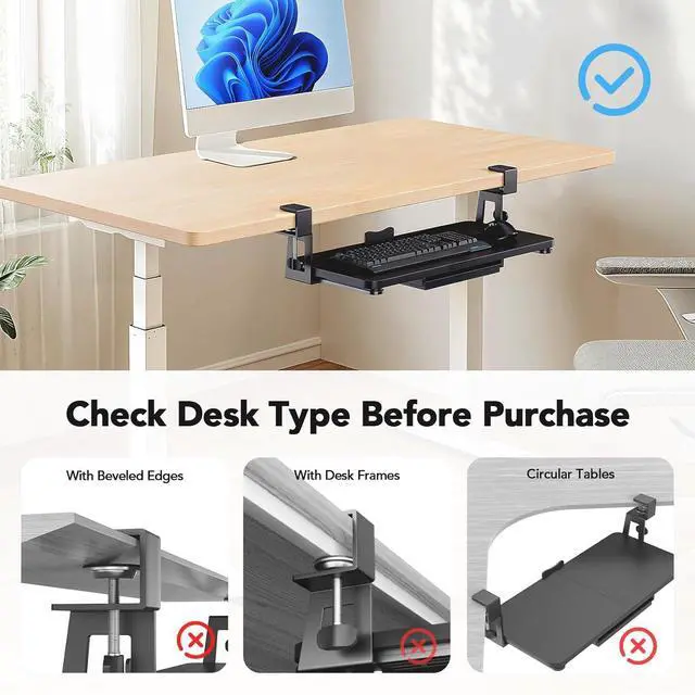 Sturdy C-Clamp Mounting: This keyboard tray under desk slide securely attaches with dual C-clamps to desks 0.39-1.57 thick (1.57" Maximum Desk Thickness) without damaging your desktop. With a weight capacity of 11 lbs, the keyboard tray can support typing for both sitting and standing positions. Before purchasing, please make sure that your desk surface does not exceed a thickness of 1.57".
