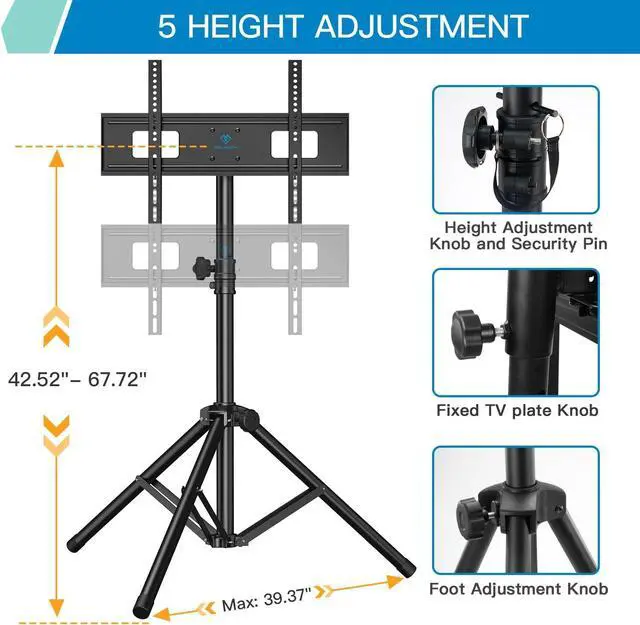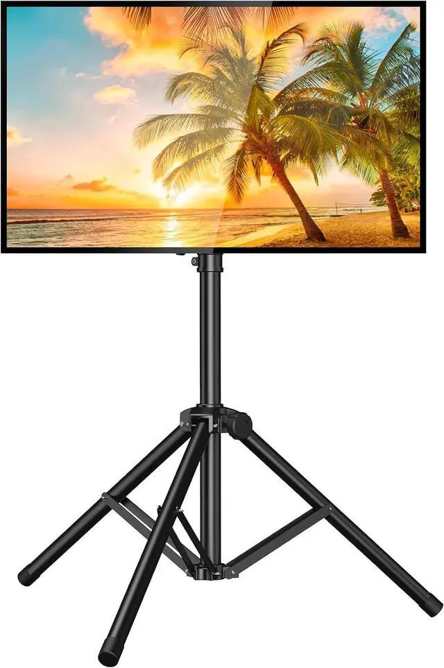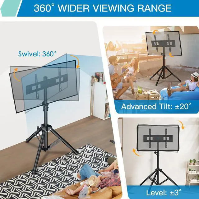 ±20° Tilt & Swivel 360°, Ultimate Viewing ExperienceExperience a truly immersive and flexible viewing experience with the smooth 360°swiveland ±20°tilt functions. Easily adjust the screen to avoid glare and achieve the perfect viewing angle from any seat in the roomwhether you're enjoying a movie night in the living room, a game outdoors in the yard, or a presentation in a conference room. This tripod TV stand is ideal for corners and tight spaces, providing an ultimate viewing experience anywhere.
