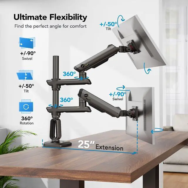One Mount, Endless Flexibility: This ultrawide monitor arm gives you total control over your screen setup. The arms extend up to 25" so you can enjoy +50°/-50° tilt to reduce glare, 180° swivel, and 360° rotation to switch between portrait and landscape views. Whether for work or play, you can enhance productivity and reduce strain with ease.