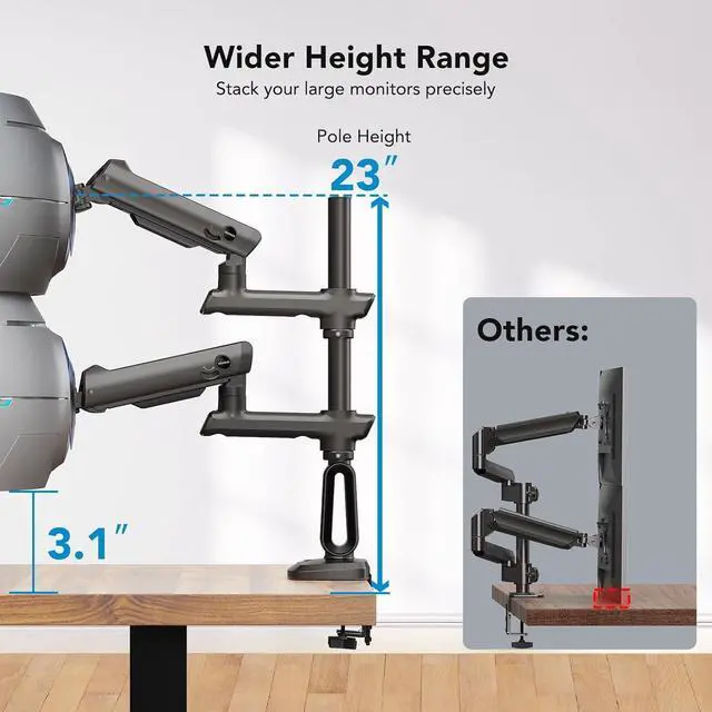 Wider Height Range: This tall monitor mount features a 23" pole and up to 32.4" of height adjustment 50% taller than standard arms. It raises your screen to eye level, helping improve posture and reduce neck strain. it also frees up 90% valuable desk space for your keyboard, speaker, gamepad, or accessories.