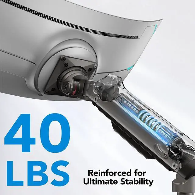 Durable and Dependable: This HUANUO dual monitor arm is constructed in high-strength aluminum alloy, and features a reinforced VESA head, lock ring, and 20% thicker arms for ultimate stability. Supporting monitors up to 40 lbs, it has passed rigorous testing, including 50,000 cycle motion tests and a 3X load test. So it'll keep your monitor securely in place for years.