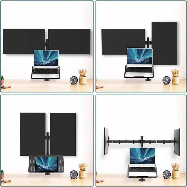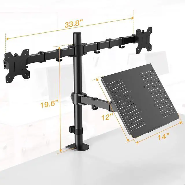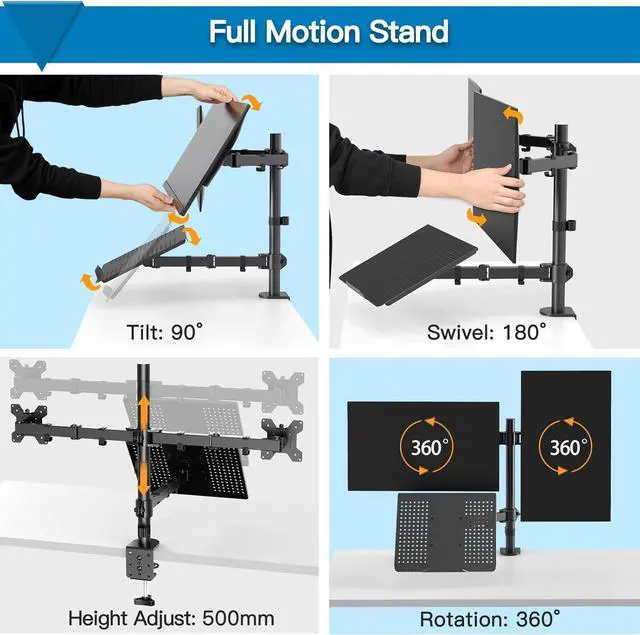 FULL MOTION - This desk monitor laptop mount for the monitors and tray offer 90° tilt, 180° swivel, and 360° rotation to provide ideal viewing and typing angles for maximum comfort.
