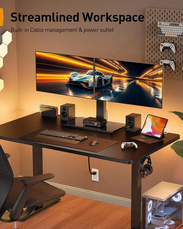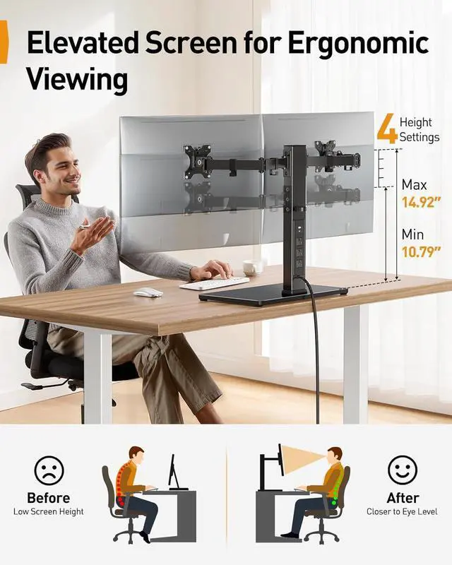 Convenient Power Access & Cable Management: Our monitor desk stand features a built-in power strip with 6.5ft power cable. It has a USB-A port, USB-C port, and three AC outlets. Easily power all your devices directly on your desktop. Cable management keeps everything organized.