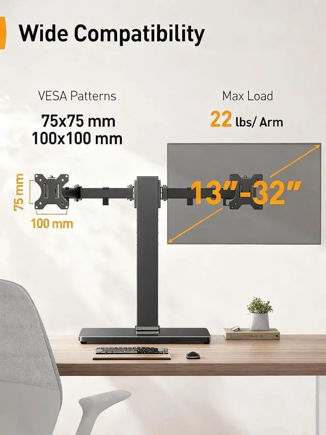 Wide Compatibility: The Perlegear dual monitor stand is compatible with most 1332 flat or curved screens weighing up to 22 lbs and supports VESA mounting patterns of 75 x 75mm or 100 x 100mm. Please check the size, weight, and VESA pattern of your monitors before purchase.