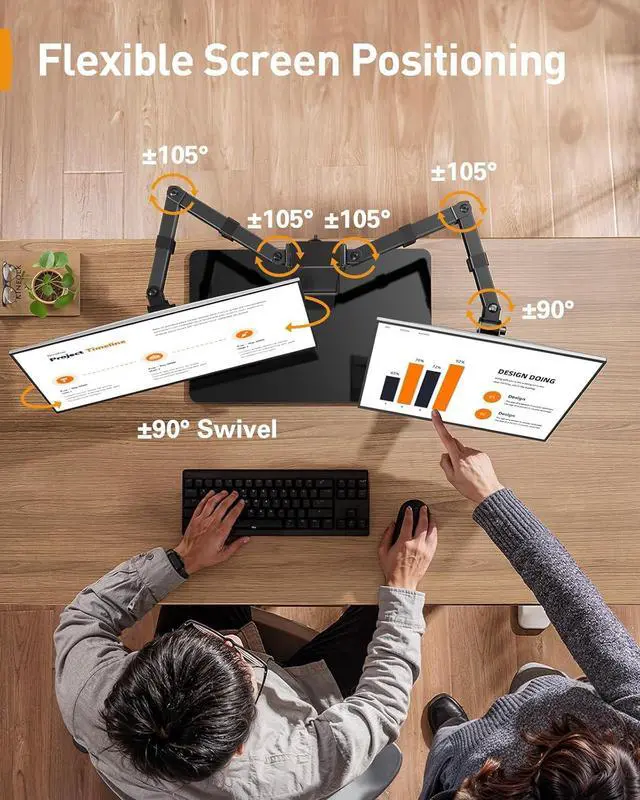 Flexible Arms: Our monitor stand for desk enables ±45° tilt, ±90° swivel, and 360° rotation. Easily adjust each screen to the desired angle and switch effortlessly between portrait & landscape orientation. Enjoy smooth adjustment for ultimate viewing comfort!