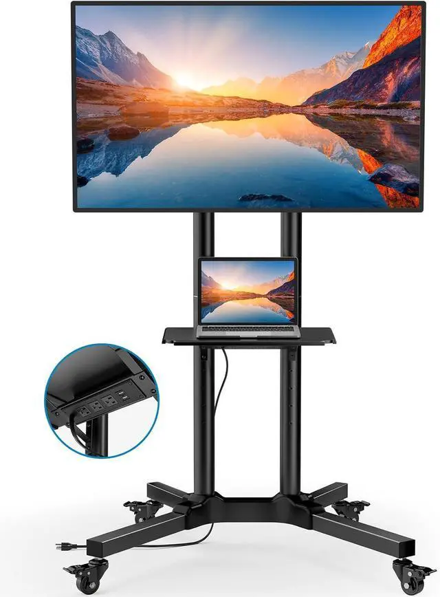 HUANUO Rolling TV Stand with Power Outlet for 32-85 Inch Flat/Curved LED TVs, Tilt TV Cart with Adjustable Shelf, Mobile TV Stand on Wheels Holds up to 132 lbs Max VESA 600x400mm HNTVMC01