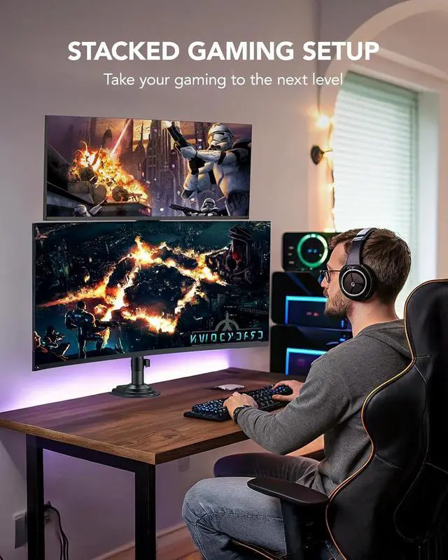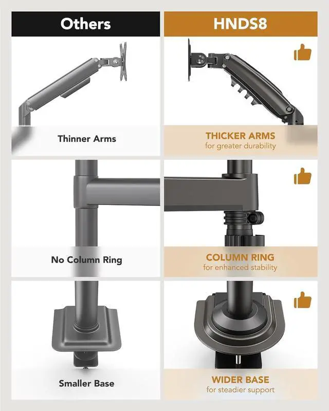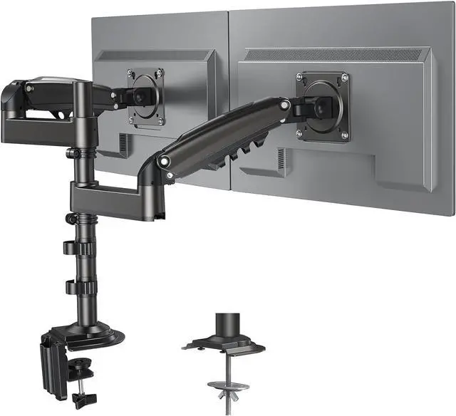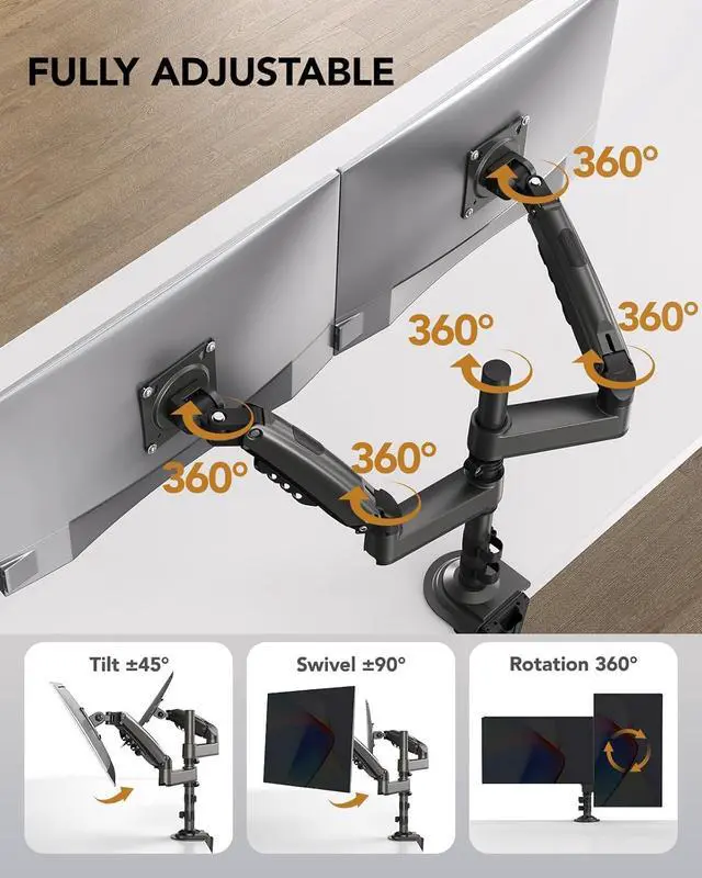 Full-Range Adjustability:This dual monitor stand delivers superior flexibility with +45° to -45° tilt,180° swivel,and 360° rotation.The HUANUO monitor holder features a built-in high-quality pneumatic spring.Simply push the arm up or down to smoothly position your screen at the perfect height
