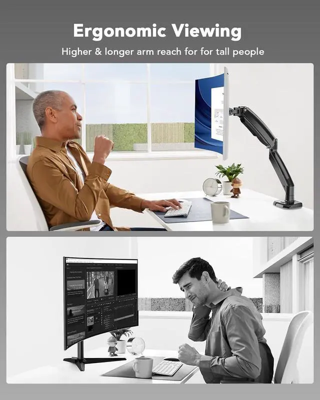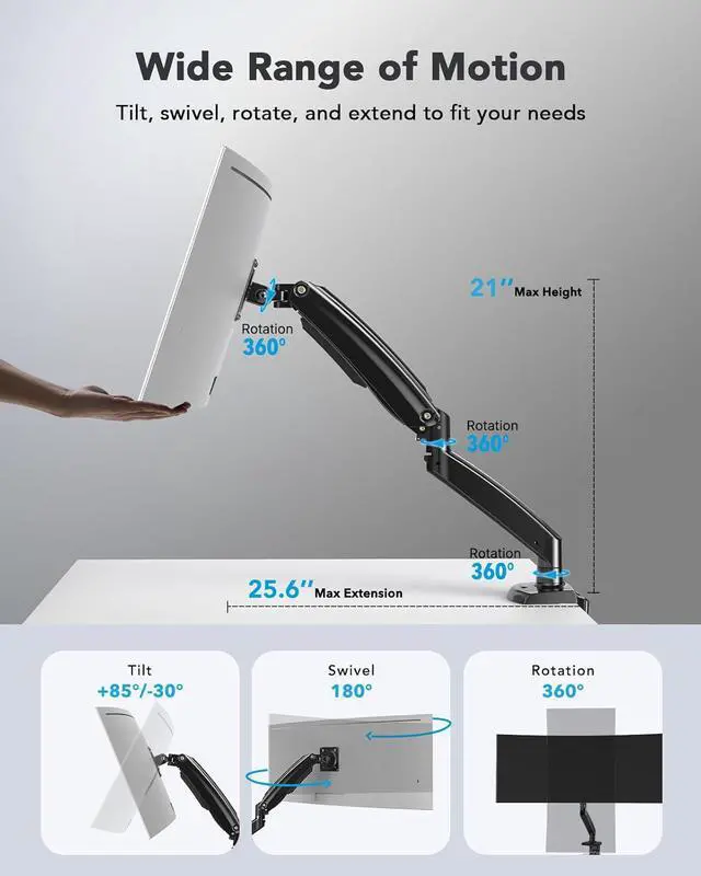 Optimized for Ergonomics: The monitor desk mount allows you to adjust the screen's tilt (from +45° to -45°), swivel (180°), and rotate (360°) effortlessly. The ultrawide monitor arm offers a 21.1" height adjustment and a 25.6" extension, making it ideal for standing desks, gaming setups, or other workspaces where an optimal viewing angle is key.