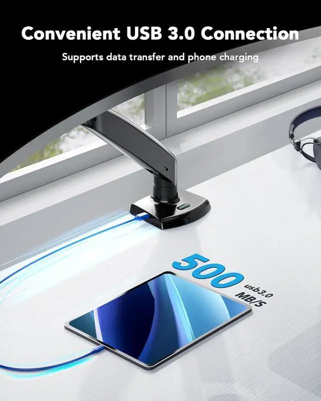 Enhanced Workspace Organization: This VESA monitor stand features a built-in USB 3.0 port that supports 500MB/s data transfer, perfect for connectivity and charging. It also includes integrated cable management that saves up to 30% more desk space compared to traditional fixed stands, making this computer monitor arm the perfect solution for a minimalist desk.