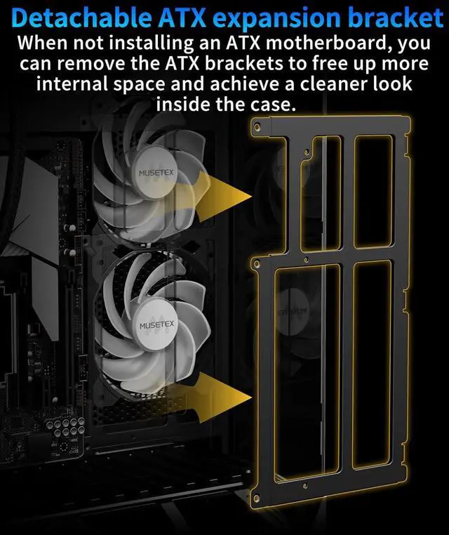 Removable ATX Extension BracketThis pc case comes pre-installed with a removable ATX expansion bracket. If an ATX motherboard is not required, its bracket can be removed to free up internal chassis space and achieve a cleaner interior. We recommend pairing with a Micro motherboard for a more spacious visual effect.