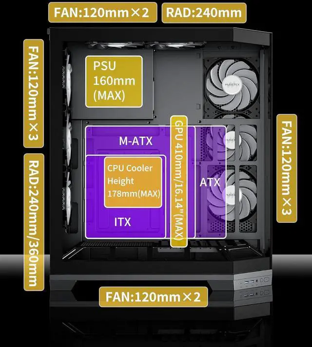 Tower Case Powerful Space LayoutCompatible with most mainstream hardware in the market,support GPU up to 410mm(16.14"),support CPU cooling height up to 178mm,support top mounting up to 240mm liquid RAD and rear mounting up to 360 liquid RAD,support PSU up to 160mm(6.3").