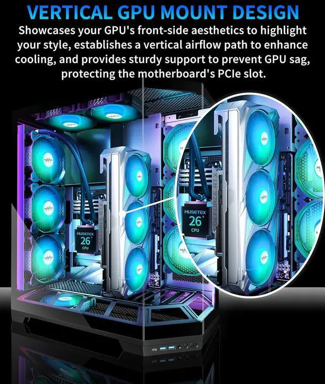 Vertical GPU Mount DesignMUSETEX's GR3 gaming pc case features a vertical direct-insert GPU installation design, perfectly showcasing the front aesthetics of the GPU and highlighting personalized style. It establishes a vertical airflow path to enhance cooling efficiency while providing sturdy support to prevent GPU sag and protect the motherboard's PCIe slot.Traditional vertical GPU installations require a riser cable, which can impact GPU performance. Through innovative architectural design, our solution allows the GPU to be directly inserted into the motherboard's native slot, eliminating the need for a riser cable and reducing performance loss by 5%-30%.