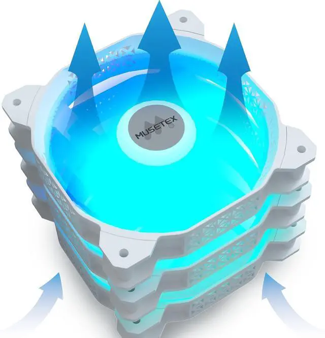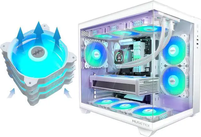 - MUSETEX offers a great gaming pc case Y6 for visual experience and setup experience,with 6 pre-installed PWM ARGB fans, the two fans on the side adopt reverse blade design for good heat dissipation and more beauty. White pc case breaks black conventional impression, with 270° fully transparent dual tempered glass panels for a wider field of view than most of the same atx case on the market,which can display user's high end PC hardware and beloved dolls,and will harvest cool admiration from frien