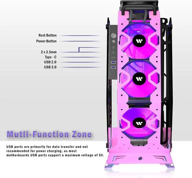 [Powerful cooling ]-- C570 PC case is pre-installed 5 PWM ARGB Fans. The unique open design can keep the GPU Temperature continuously low,making your computer work more smoothly.