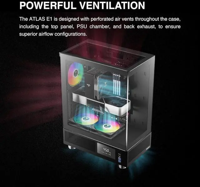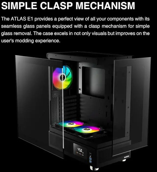 Panoramic View Case & Simple Clasp Mechanism: The ATX Case ATLAS E1 provides a perfect view of all your components with its seamless glass panels equipped with a clasp mechanism for simple glass removal. The mid tower case excels in not only visuals but improves on the user's modding experience.