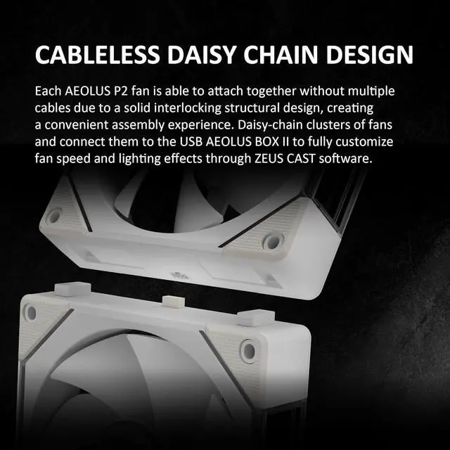 Cableless Daisy Chain Design: AEOLUS P2 fans connect via interlocking framesno extra cables needed. Link multiple fans and control lighting, speed, and effects through ZEUS CAST with the AEOLUS BOX II.
