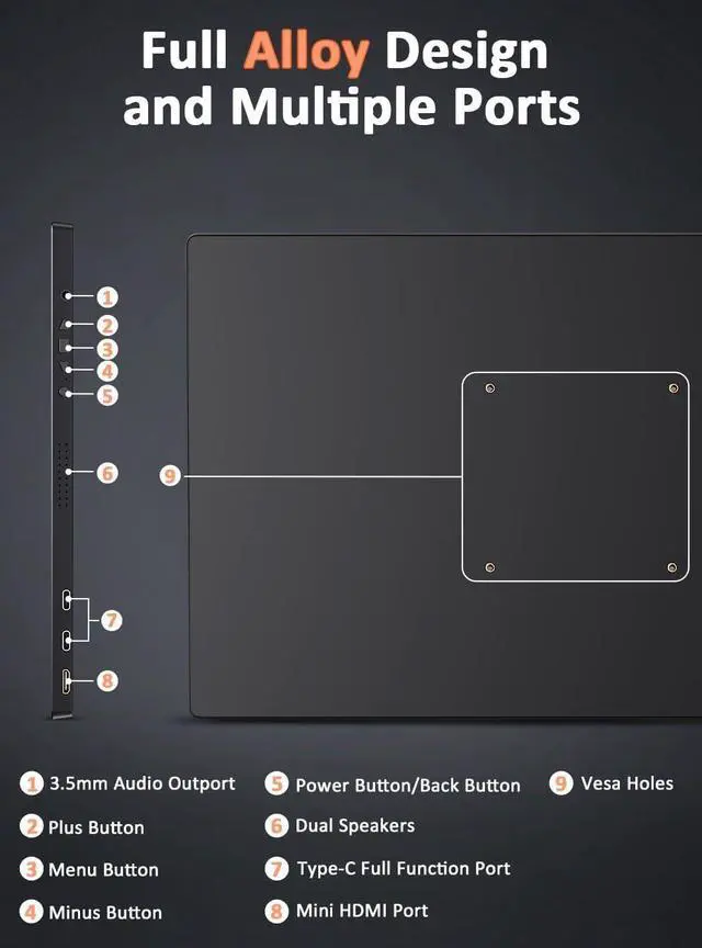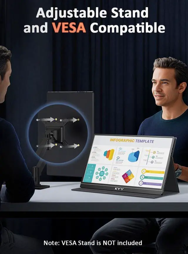 [ VESA Mountable & Magnetic Cover Monitor]: KYY 4K portable monitor for laptop comes with a premium PU leather magnetic protective case for reliable protection during your travels. Four VESA mounting holes on the 4K monitors back allow for easy and secure installation on VESA mounts in both landscape and portrait orientations (VESA mount not included). The VESA mounting dimensions are 75 x 75 mm, and M4 x 3 mm screws are recommended for installation