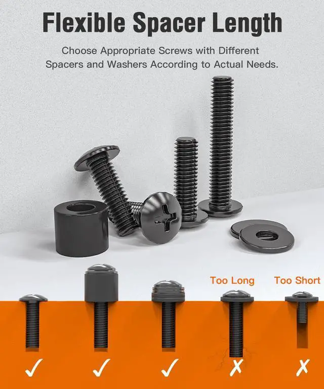 Flexible Combination: The mount screws kit includes screws and spacers of different size to combine a proper length for various needs, such as uneven TV backs, curved TVs or when screws are too long