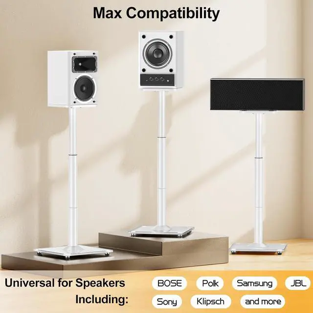 Universal Design - The rear speaker stands with 9.8"x9.8" plate can hold most speakers up to 22 LBS, such as the speakers from Klipsch, Sony, Yamaha, Edifier, Polk, Samsung, Bose, Vizio, JBL, Harmon Kardon and more.