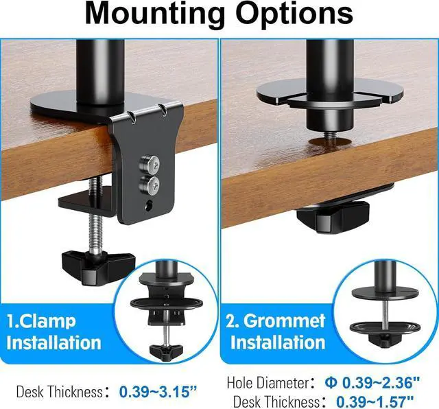 Stable Construction - Stacked monitors in one pole securely on the C-clamp or grommet. C clamps fit desk thicknesses up to 3.15" while grommet mounting works well with desk thicknesses up to 1.57". Meet your needs with different desks, stable and not easy to shake