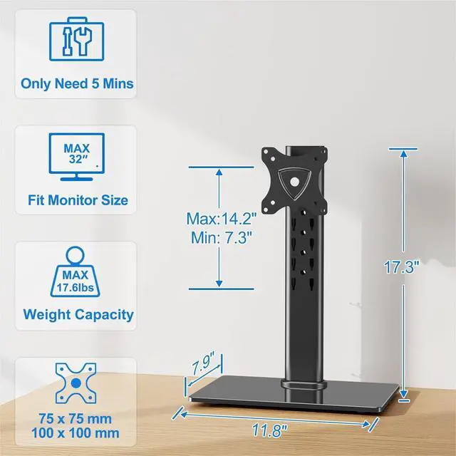 Universal Compatibility - ErgoFocus single monitor stand holds 13,15,17,19,21,23,27,30 and 32 inch LCD LED flat or curved screens, supports up to 17.6 lbs, compatible with VESA patterns 75x75 mm and 100x100 mm. Designed with a solid tempered glass base that holds your monitor securely and steadily on your desktop