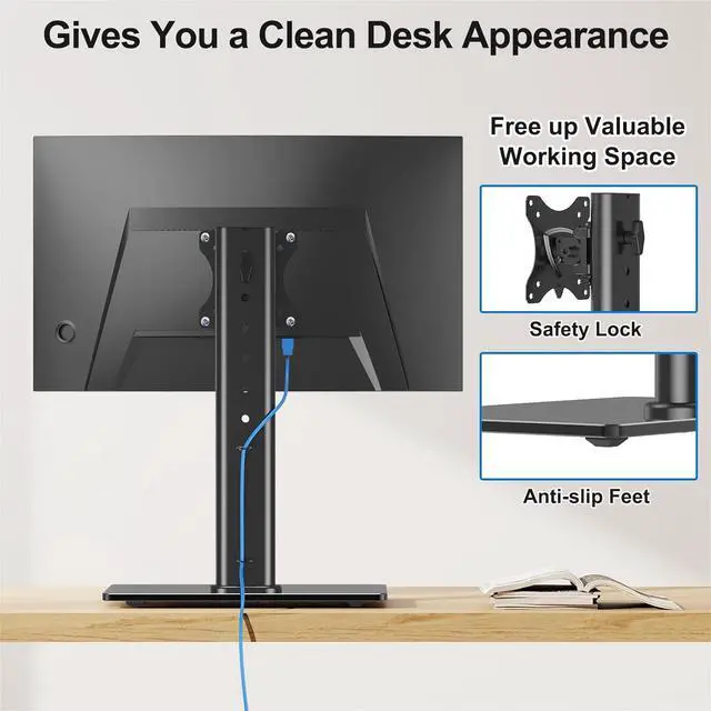 Free up more workspace - It's time to say goodbye to messy desktops! This single monitor stand comes with cable management to keep cords clean and organized. It also lift your monitor away from your desktop, freeing up valuable space for other items and making your desk neater and visually more comfortable. And with foot pads to prevent skidding while protecting the desk from scratches