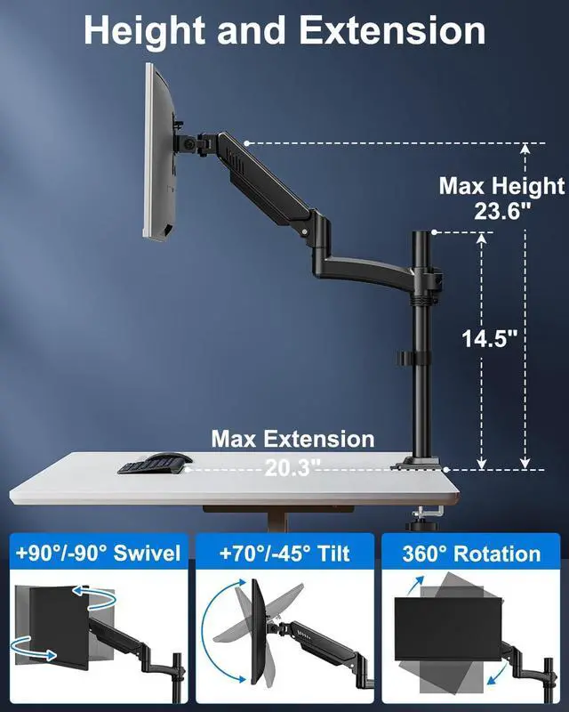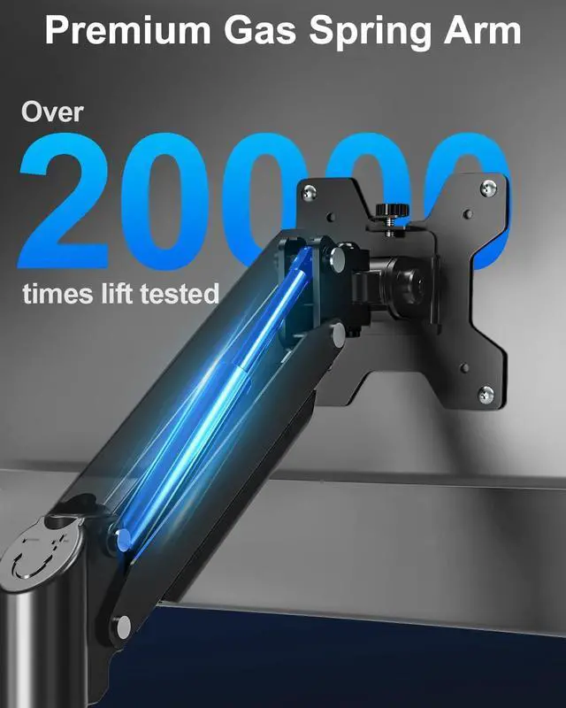 Ergonomic Design - Features Features +70°/-45° tilt, ±90° swivel and 360° rotation, enabling seamless transitions between portrait and landscape modes to reduce neck strain. Equipped with a high-quality gas spring mechanism, which has undergone rigorous 2,000+ cycle testing to ensure smooth and reliable movement, this mount is ideally suited for multitasking professionals and gamers
