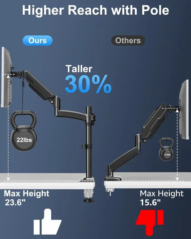 Raise Your View Experience - Worry about your monitors' height don't meet your expectation? Our dual monitor arm has extendable pole allows you to raise the monitor maximum height of 26.6 ( VESA center to desktop). Allows seamless transitions between standing and sitting positions with a single touch, ensuring ergonomic positioning for standing/sitting desks