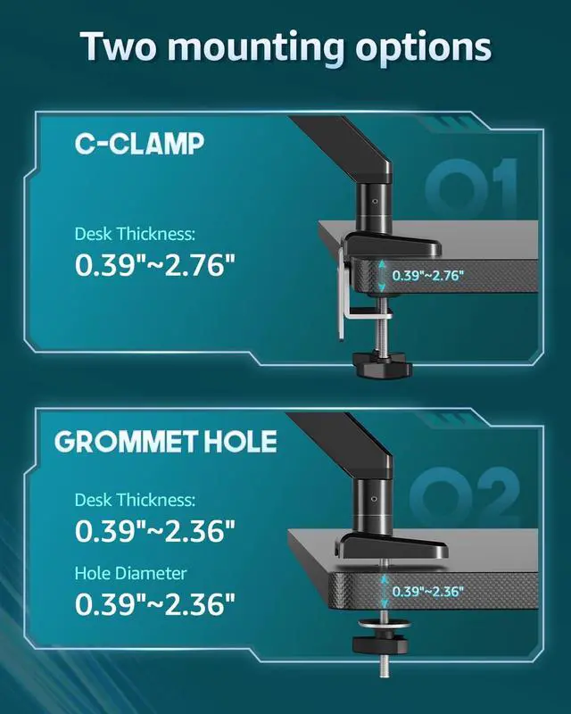 Wide Compatibility: Compliant with VESA 75×75mm/100×100mm standards, universally compatible with leading monitor brands. Dual installation options, C-clamp (0.39" to 2.76")and grommet base(0.39~2.36")offering flexible installation for diverse office setups.