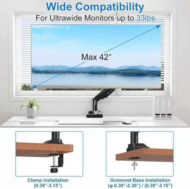 Exceptional Weight Capacity - Fits up to 49" ultrawide screens. ErgoFocus heavy duty monitor arm can handle most 13"- 49" flat and curved monitors with VESA 75x75mm or 100x100mm, supports curved screens weighing 2.2-33 lbs and flat screens weighing 2.2- 44 lbs. Compatible with Samsung Odyssey G9, LG, Dell, ASUS, Acer, MSI, HP, Sceptre, and other ultrawide monitors, covers common sizes such as 49", 43", 42", 39", 38", 35", 34", 32", 27", 24", 22" screen