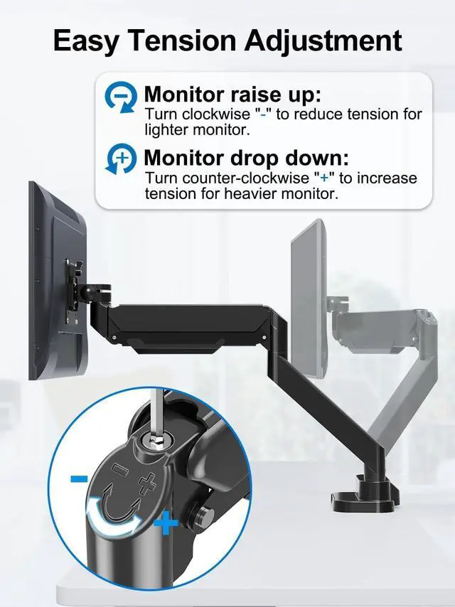 Advanced Dual-Arm Ergonomic Design - 360° Rotation & 90°/-45° tilt adjustment: Seamlessly rotate and tilt the display to reduce neck strain during extended use, supporting both portrait and landscape modes. 180°/360°swivel on arms, you'll be able to pose your screen where you want it. The quick-release VESA mounting clip allows you to quickly add and replace monitors with ease.