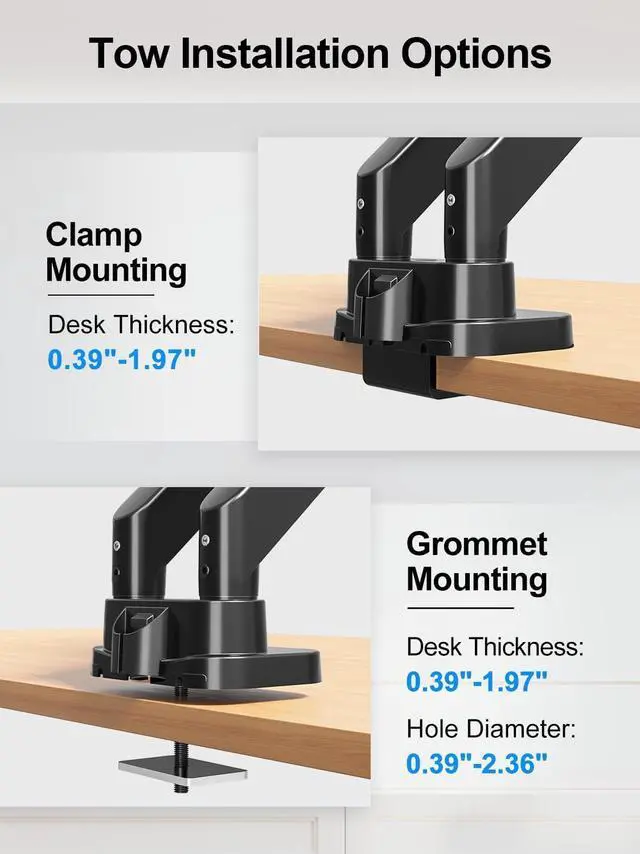 Express Setup - ErgoFocus 2 monitor desk mount provides two mounting ways, C-clamp mount(for desks 0.39"-1.77") and grommet mount(for desks 0.39"-1.77" diameter: 0.4"-2.4"), fitting desks with or without a hole. The package also comes with all the hardware you need, please check your desk thickness within this range and tighten all base screws securely to guarantee stability