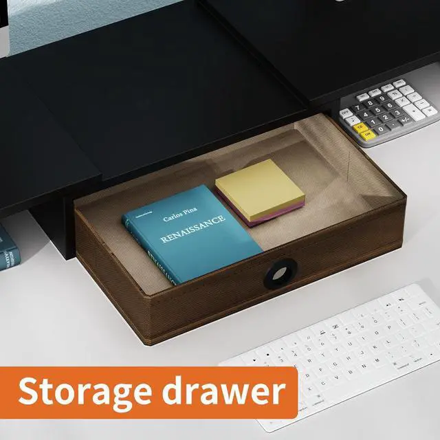 Desktop Organizer with Drawer and Pen Slots: Our computer monitor stand comes with a drawer for storing sticky notes, writing utensils, files and notebooks. There are also two pen slots on both sides of the panel.