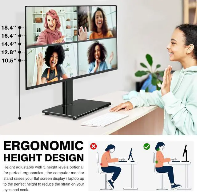 Ergonomic Design : The Free-Standing computer monitor stand riser offers -15° to +10° tilt,-70° to +70° swivel, 360° rotation and 5-level height adjustable from 10.5"-18.4". Adjust the Angle and height of the screen flexibly, release the pressure on your neck and shoulders, and maintain a good vision. You are in good shape at work and at home.