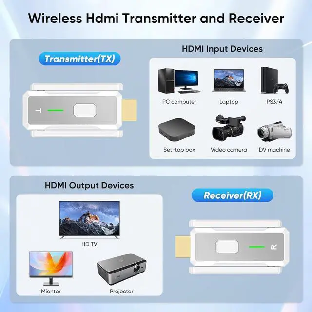 Extended Range, Plug and Play : HDMI sender and receiver wireless equipped with a dual-antenna system that enhances signal penetration, it achieves a transmission distance of up to 500 feet/150 meters, catering to diverse needs in homes and offices. Flexibly arrange your home theater or conference room, freeing yourself from cable clutter, reducing costs and hassles, and eliminating worries about tangled wires, damage, or loose connections. Note: Transmission distance may reduce to 100 feet/30 meters when passing through walls.