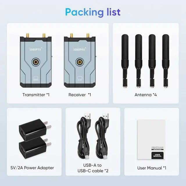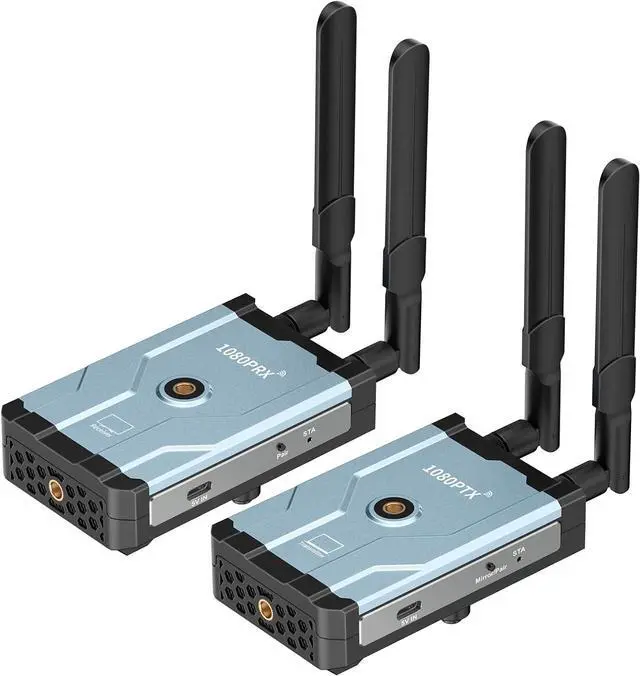 Up to 500m Stable Transmission RangeWireless hdmi transmitter and receiver adopts dual antenna design,2.4/ 5.8G high-speed transmission and strong signal. By using WiFi transmission technology and through the point-to-point connection between transmitter and receiver equipment, extends 1080P full HD HDMI signal wirelessly up to 1640ft in an open field without interference. Note: Walls, bricks or glass can shorten signal coverage or cause severe signal loss for the wireless hdmi transmitter and receiver kit
